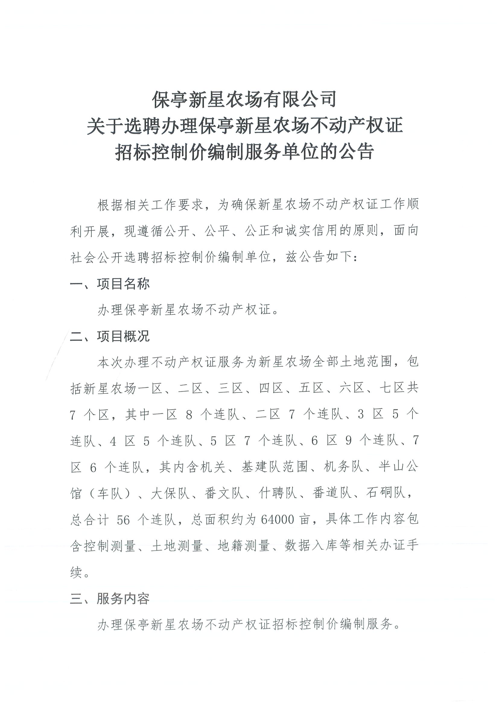 關(guān)于選聘辦理保亭新星農(nóng)場(chǎng)不動(dòng)產(chǎn)權(quán)證招標(biāo)控制價(jià)編制服務(wù)單位的公告