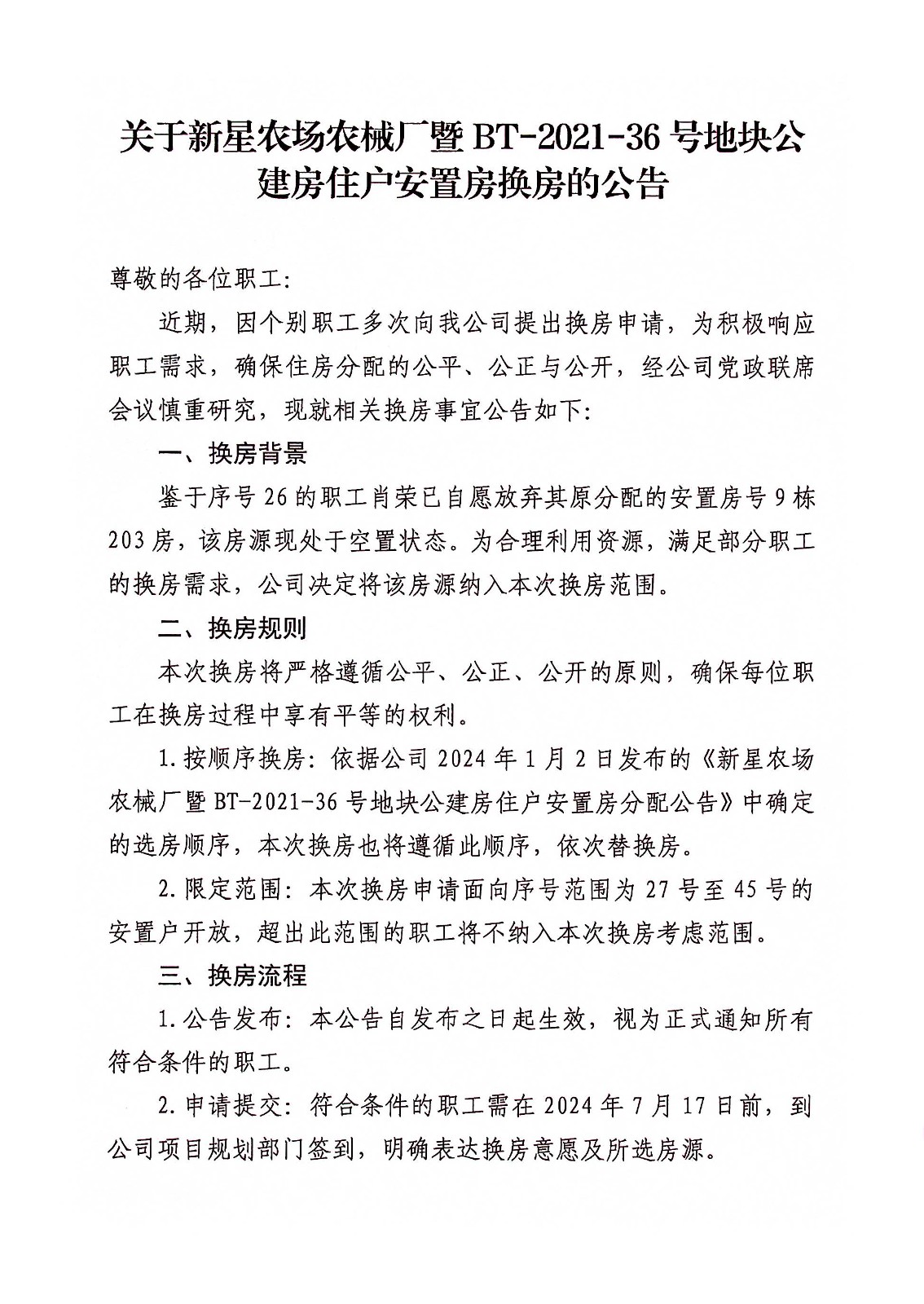 關(guān)于新星農(nóng)場(chǎng)農(nóng)械廠暨BT-2021-36號(hào)地塊公建房住戶安置房換房的公告