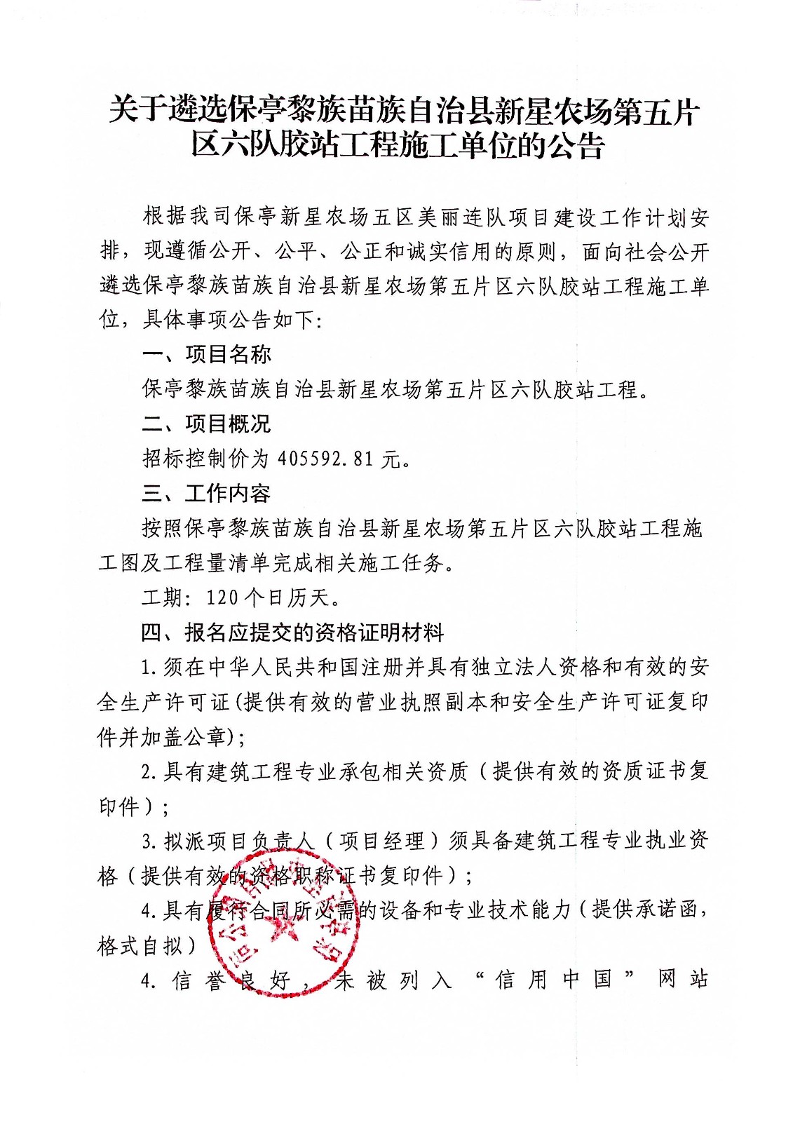 關(guān)于遴選保亭黎族苗族自治縣新星農(nóng)場(chǎng)第五片區(qū)六隊(duì)膠站工程施工單位的公告