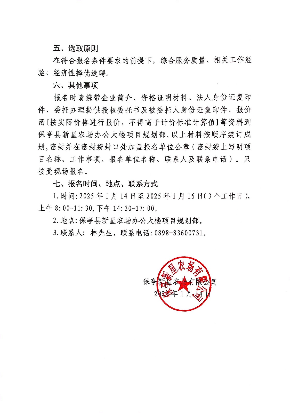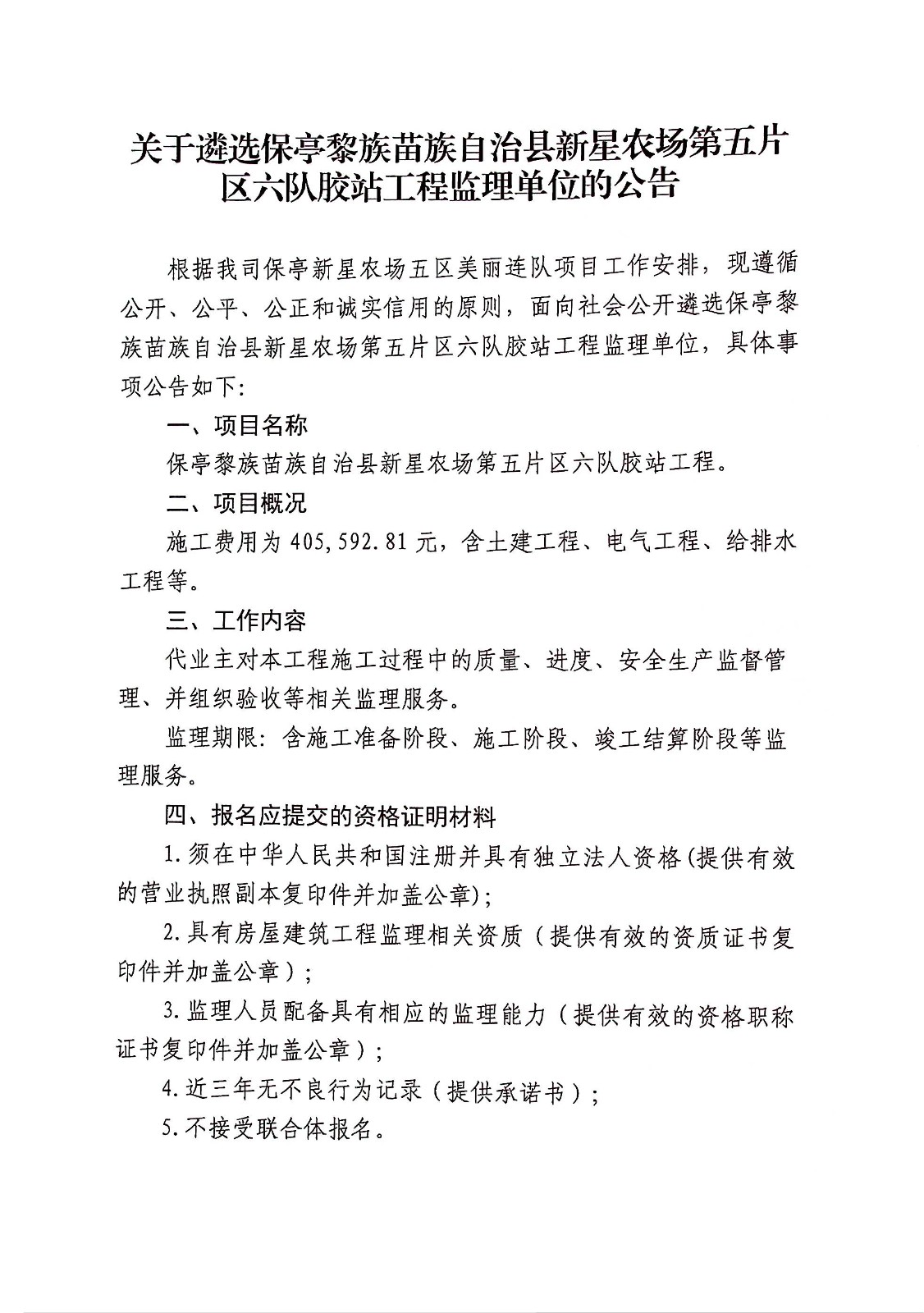 關(guān)于遴選保亭黎族苗族自治縣新星農(nóng)場(chǎng)第五片區(qū)六隊(duì)膠站工程監(jiān)理單位的公告