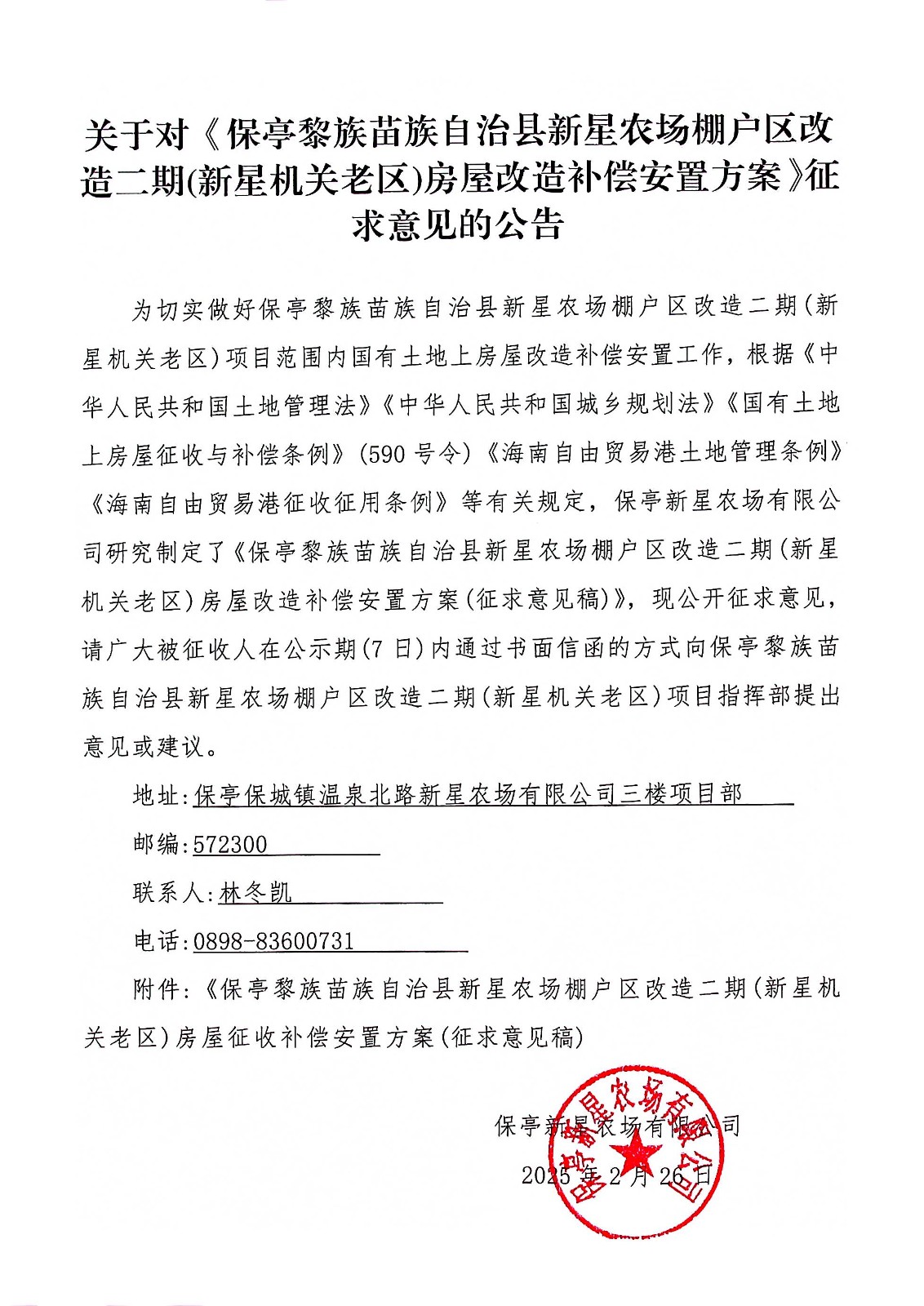 關(guān)于對(duì)《保亭黎族苗族自治縣新星農(nóng)場(chǎng)棚戶區(qū)改造二期(新星機(jī)關(guān)老區(qū))房屋改造補(bǔ)償安置方案》征求意見(jiàn)的公告